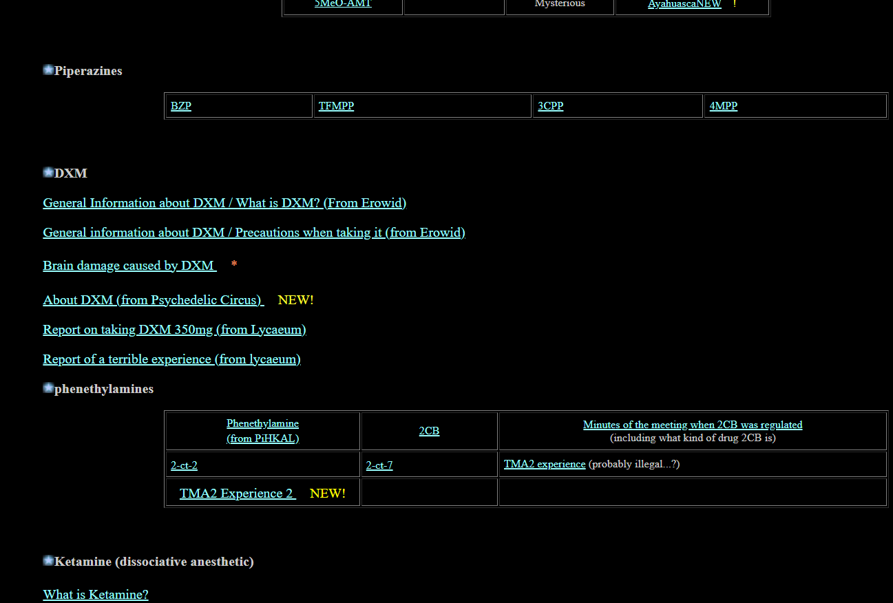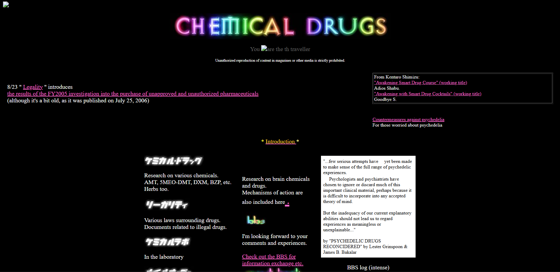 this site is extremely interesting, it has written reports and experiences, legality, harm reduction and general information on many research chemicals and substances. the creator remains anonymous, no introduction or about page, making it purely informational.
