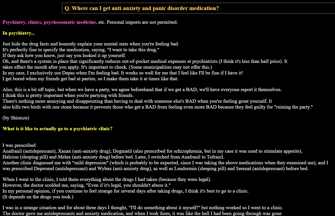 some information tucked away is how to get prescription anxiety medication and/or antidepressants. it was generally frowned upon to go to psychiatric clinics, or you were viewed as crazy, so these resources weren't as welcomed. originally it looks like it was written as advice to sooth bad trips. "just go get medicated, so you can have an easier time doing drugs!" love it. i wonder if it's ever helped anyone get diagnosed/correctly medicated.